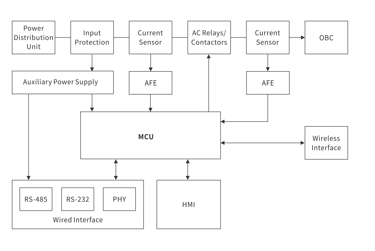 尽管在性质上比直流充电器更简单,交流充电站能够安全地将来自电网的交流电传输到汽车内。 由于受到车内空间和重量的约束,车载充电器和交流充电站一般都被限制在较低的功率(22 kW或更低),这意味着充电时间较长,一般需要数小时。 这些系统也依靠汽车的车载充电器来实现从来自电网的交流电到直流电的转换,以便为汽车的电池充电。 采取妥善的措施以保障充电器和汽车的安全至关重要。