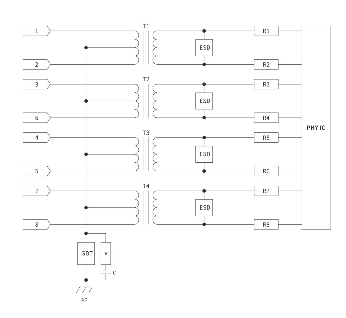 RJ45千兆网口(1 Gigabit Ethernet)在高速数据传输和复杂的电磁环境中,面对浪涌(Surge)和静电放电(ESD)干扰时,必须具备高性能的防护设计,以保证网络稳定性与设备安全。